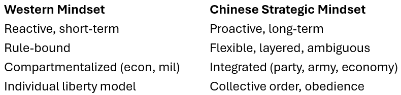 While the U.S. struggles to pass budgets or staff agencies every 2 to 4 years, China’s rulers are crafting 25-, 50-, and 100-year plans. Their vision is shaped by: