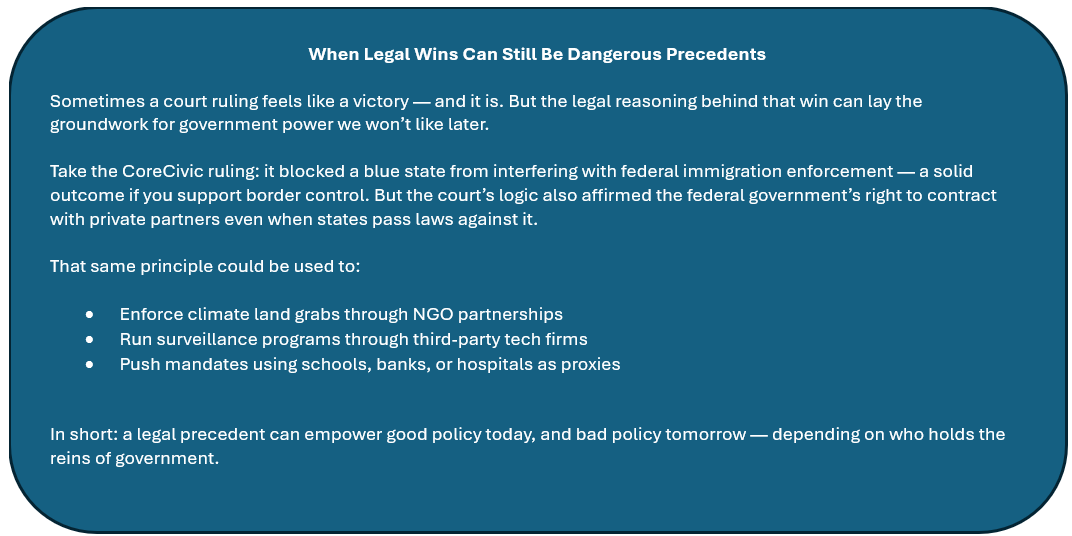 This trend didn’t happen by accident. It has evolved across both Republican and Democratic administrations. The appeal is obvious: third-party implementation of controversial or constitutionally sensitive programs makes it easier to avoid legal challenges and political backlash.