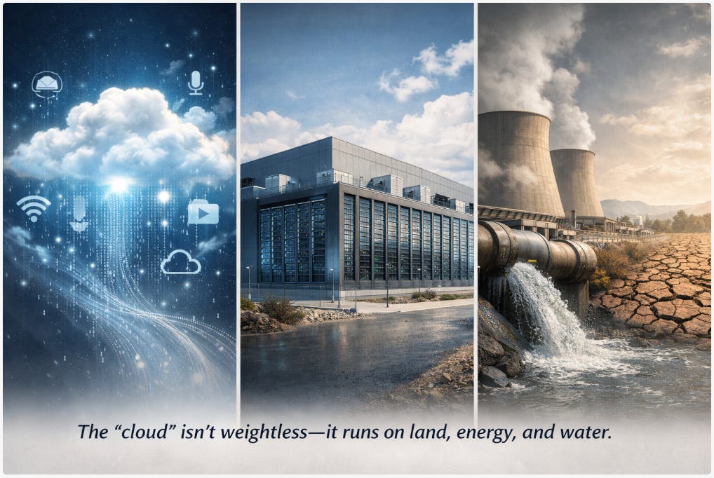 We’re told that the future is digital—that AI is critical to our national economy and security. It sounds clean, efficient, almost weightless. But the reality is much more grounded. The cloud isn’t floating anywhere. It’s built on land, powered by massive infrastructure and, increasingly, drawing from one of our most finite resources: water.