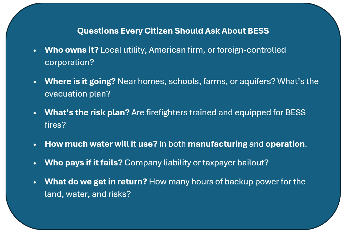 BESS may have a role to play in short-term grid balancing. But the push to blanket communities with industrial battery farms—without transparency, without respect for property rights, and without safeguarding against health, property and foreign influence risks—should alarm us all.