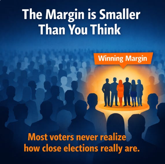 This PDF gives you something to consider if you are tempted to use the excuse that one vote doesn’t matter. How 100 Votes Could Change America. Please note the yellow highlighted facts!