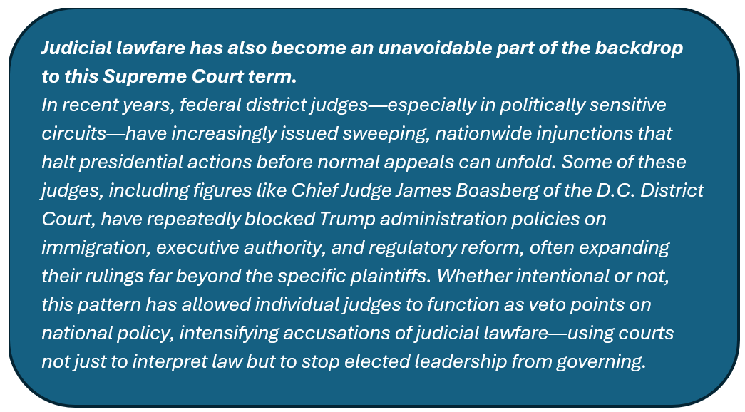 With that in mind, the list below is a current “snapshot” of major 2025–26 cases granted to date — including a look at some that might define this Court’s legacy. Will executive powers be less hindered? Will the administrative state return to checks and balances?