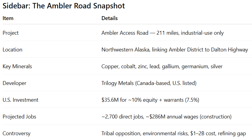 For most Americans, it’s a reminder that supply chains and sovereignty are tightly intertwined — and that strategic minerals may be the new oil. For supporters, Ambler is a bold pivot away from weakness. For opponents, it’s another example of government partnering with corporations.